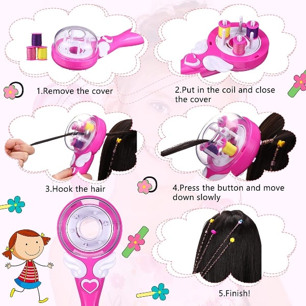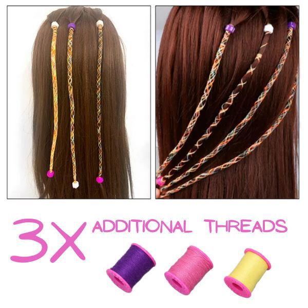 - Pakuotėje yra: Komplekte: 1x plaukų pynimo mašina, 12x plaukų segtukai, 3x siūlas (geltonas, rožinis ir violetinis siūlas), 2x priedas, kad būtų lengviau naudoti.