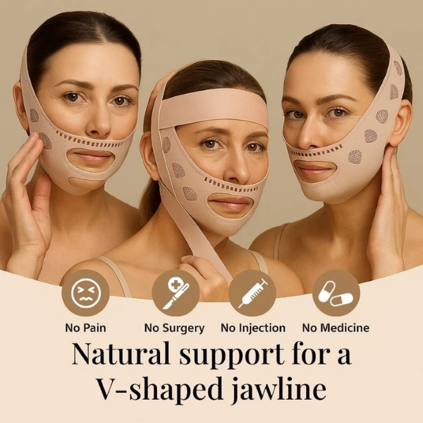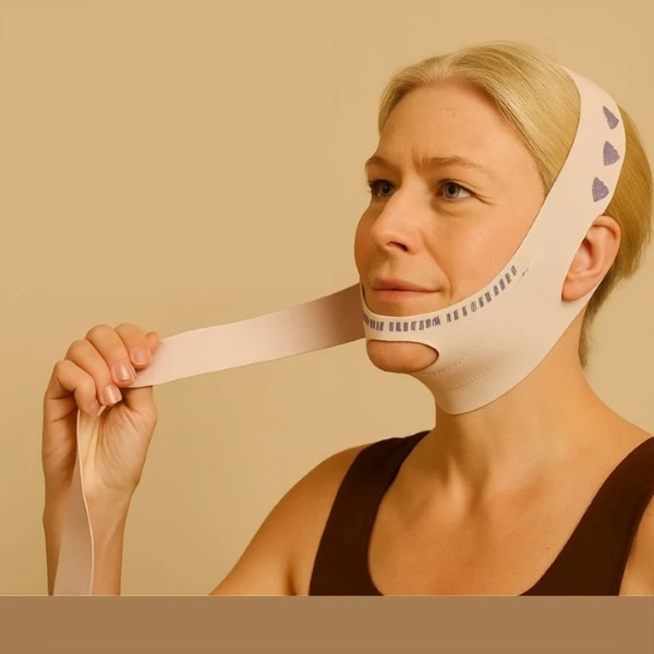Minkštas pakeliamasis suspaudimas padeda sumažinti paburkimą ir laikui bėgant išryškina žandikaulio liniją.
